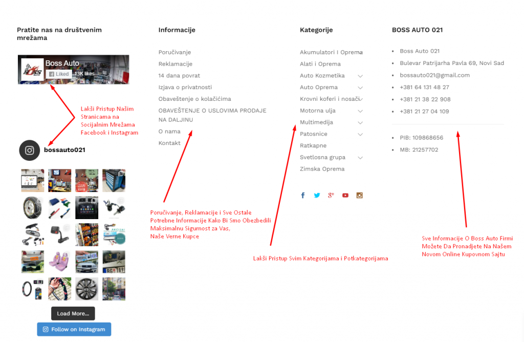 Na samom kraju naše početne stranice, naćićete deo sajta sa informacijama, u kojem možete da pročitate sve detalje vezane za poručivanje, reklamacije, izjave o privatnosti, i ostalo. Isto tako, omogućili smo Vam da putem tog dela (slika br. 5) možete da još jednom pregledate sve naše kategorije, kao i informacije o samoj radnji Boss Auto 021 i gde se nalazimo kao i kako da nas kontaktirate. Skroz levi deo (slika br. 5) odnosi se na pristup našim stranicama na socijalnim mrežama Instagram i Facebook, koje možete da posetite i klikom ovde.