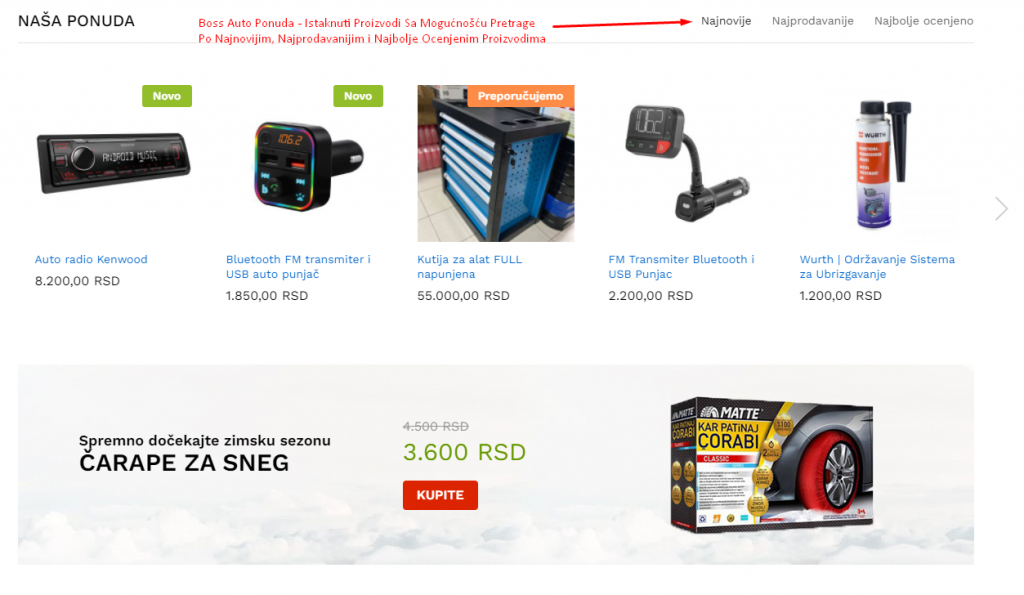 Ispod akcijskih proizvoda dolazimo na delić našeg sajta u kojem možete da vidite našu ponudu. U sklopu tog segmenta sajta, videćete neke od proizvoda koji su tek dodati na Boss Auto online kupovni sajt. Isto tako, u sklopu tih slika, videćete i delić na kojem piše da li je taj proizvod preporučen od strane Boss Auto tima, da li je novi, tj tek pridodat ili da li je na popustu taj proizvod. Promena o kojoj smo pisali se ogleda u tome što smo omogućili da na ovom delu sajta obavite pretragu putem najnovjih, najprodavanijih ili najbolje ocenjenih proizvoda (slika br. 4).