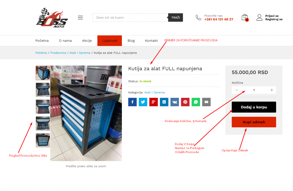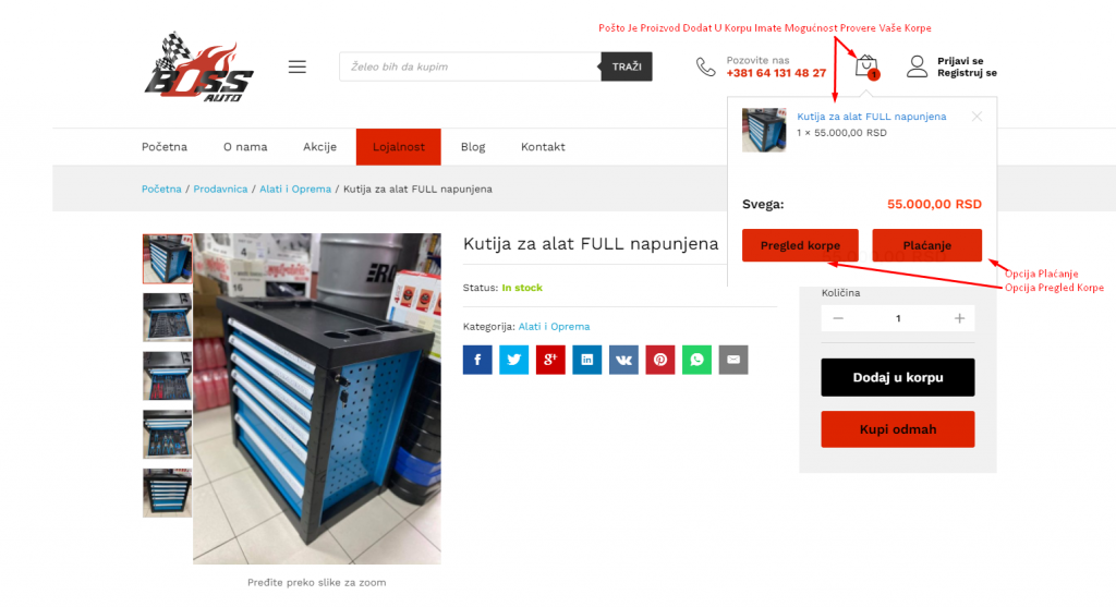 Na slici br. 6 možete da vidite izgled naše nove online kupovne prodavnice. Kao što je i na samoj slici obeleženo, možete da vršite pretragu ručno, po kategoriji, cenovnom opsegu, a da pri tome vidite koji su to novi proizvodi, koji su na akciji i koliku uštedu ćete ostvariti ako ih poručite. To naravno nije sve. Za primer kupovine, tj poručivanje proizvoda smo se odlučili da Vam predstavimo Kutiju za Alat koja je napunjena sa svim alatima i dodatnom opremom (slika br. 7)