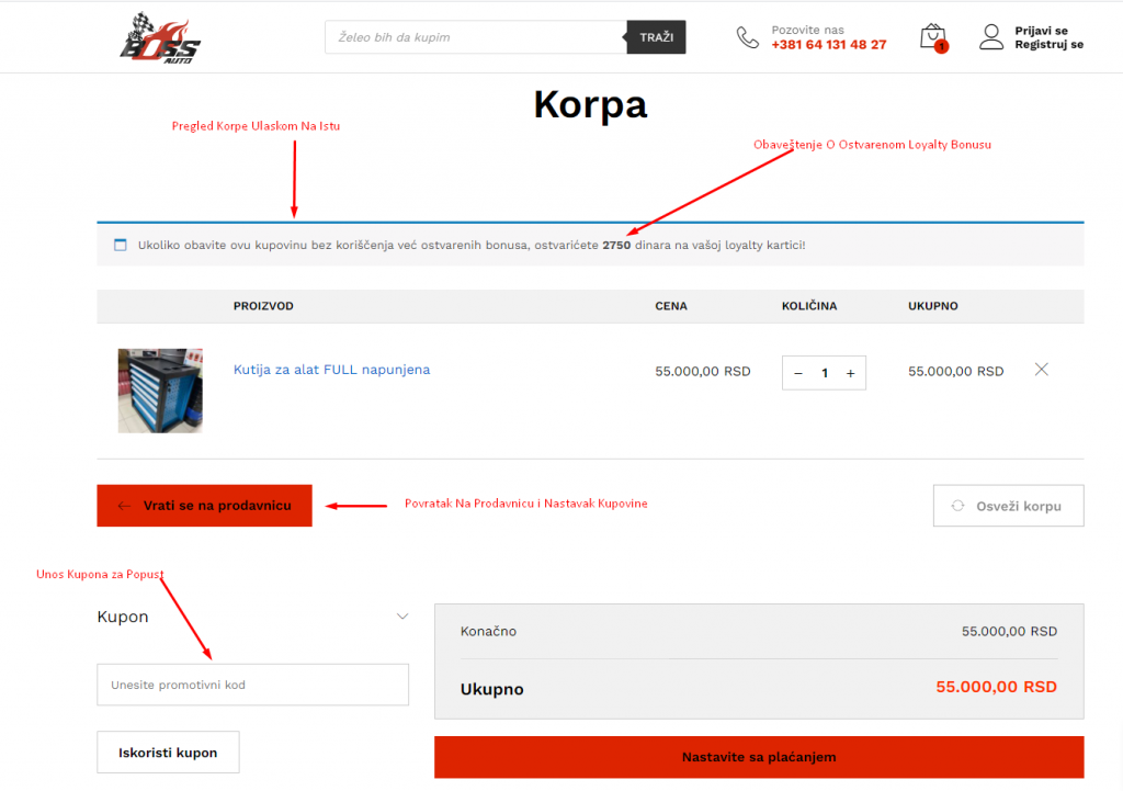 Zbog čega je dobro da posetite stranicu Vaše korpe je što smo omogućili da Vam tu odmah izračunamo i napišemo koliki ste loyalty bonus ostvarili putem ove online porudžbine. Kao što vidite na slici br. 9, za kupovinu koju smo uzeli za ovaj primer, a to je Kutija Alata, Vi biste ostvarili loyalty bonus u iznosu od 2750 dinara, a kako možete da iskoristite taj loyalty bonus, pročitajte ovde. Pošto ste sve proverili da li je u redu, i ako imate, dodali kupon, da ubacili smo i tu opciju, da sa kuponima za popust možete dodatne beneficije da ostvarite, možete da nastavite sa Vašim plaćanjem.