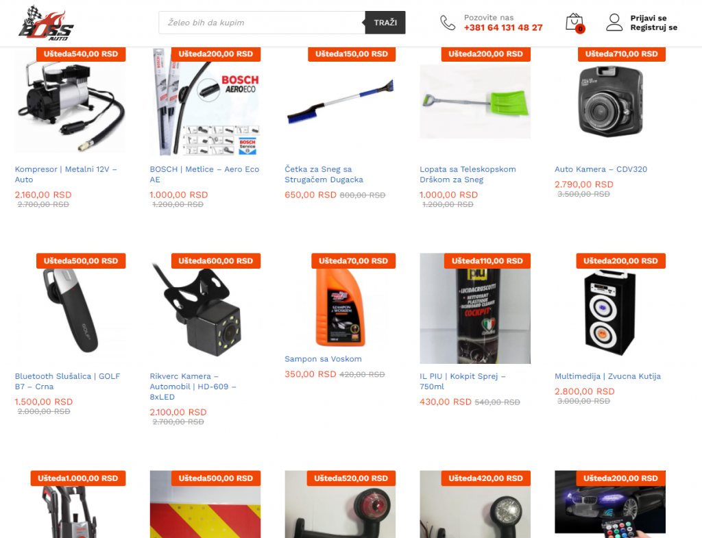 Prvo što ćete primetiti kad uđete na naš online kupovni sajt je da su Vam odmah predstavljeni par proizvoda koji su među najtraženijima na tržištu i kod nas u radnji. Olakšali smo Vam da brže dođete do njih. Isto tako, primetićete da je samo pravljenje naloga, registracija, kao i provera stanja Vaše korpe (ukoliko se dodali proizvod u korpu) jednostavnija i pristupačnija (slika br. 1). Isto tako videćete i pregledniji meni. Segment za pretragu sajta, gde jednostavnim kucanjem možete da pronađete i pregledate celu našu ponudu proizvoda iz sfere auto opreme i auto kozmetike.